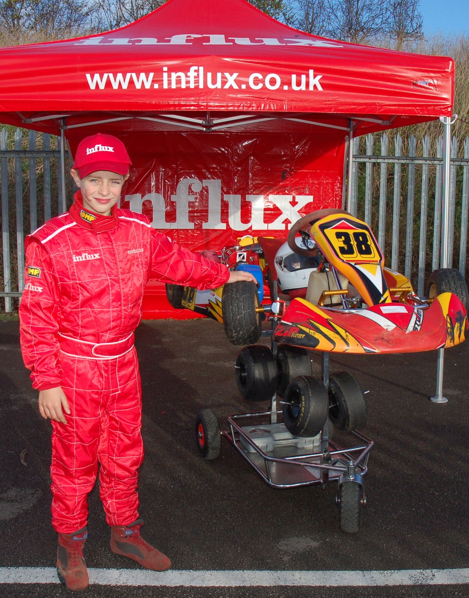 Eleven-year-old karter Jacques Morley of Marham, near King’s Lynn in Norfolk, who is competing in the MSA British Cadet’s Championship, has managed to secure a sponsorship deal with a major local company. He’s now supported by Influx, the glossy motoring magazine published by Adrian Flux Insurance Services of nearby East Winch.