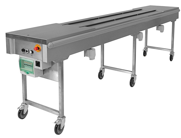 Silent and smooth-running, and with anti-static properties, Moffat conveyors all have simple control panels with individual stop and start buttons, as well as variable speed controls and forward/reverse operation. Emergency stop switches are located at each end, while the receiving end has a photo-sensor to prevent tray clashing and breakages. Splash-proof power sockets are protected by safety Residual Current Breakers with Overload protection (RCBOs). A splash-proof switchboard and mains isolator is located at the end of each conveyor, underneath the control panel.