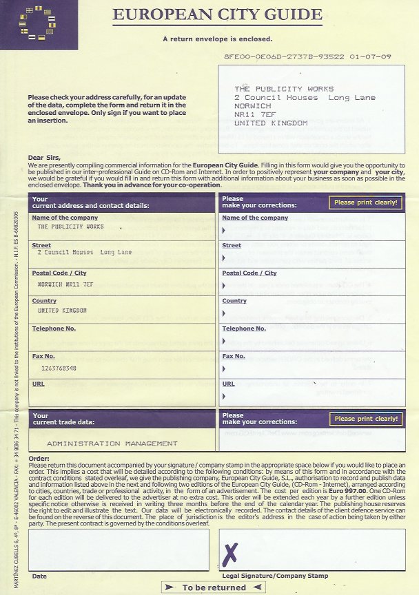 There’s a cesspit in continental Europe which sends out these forms asking you to check your company details for an ‘inter-professional guide on CD-Rom and Internet’.