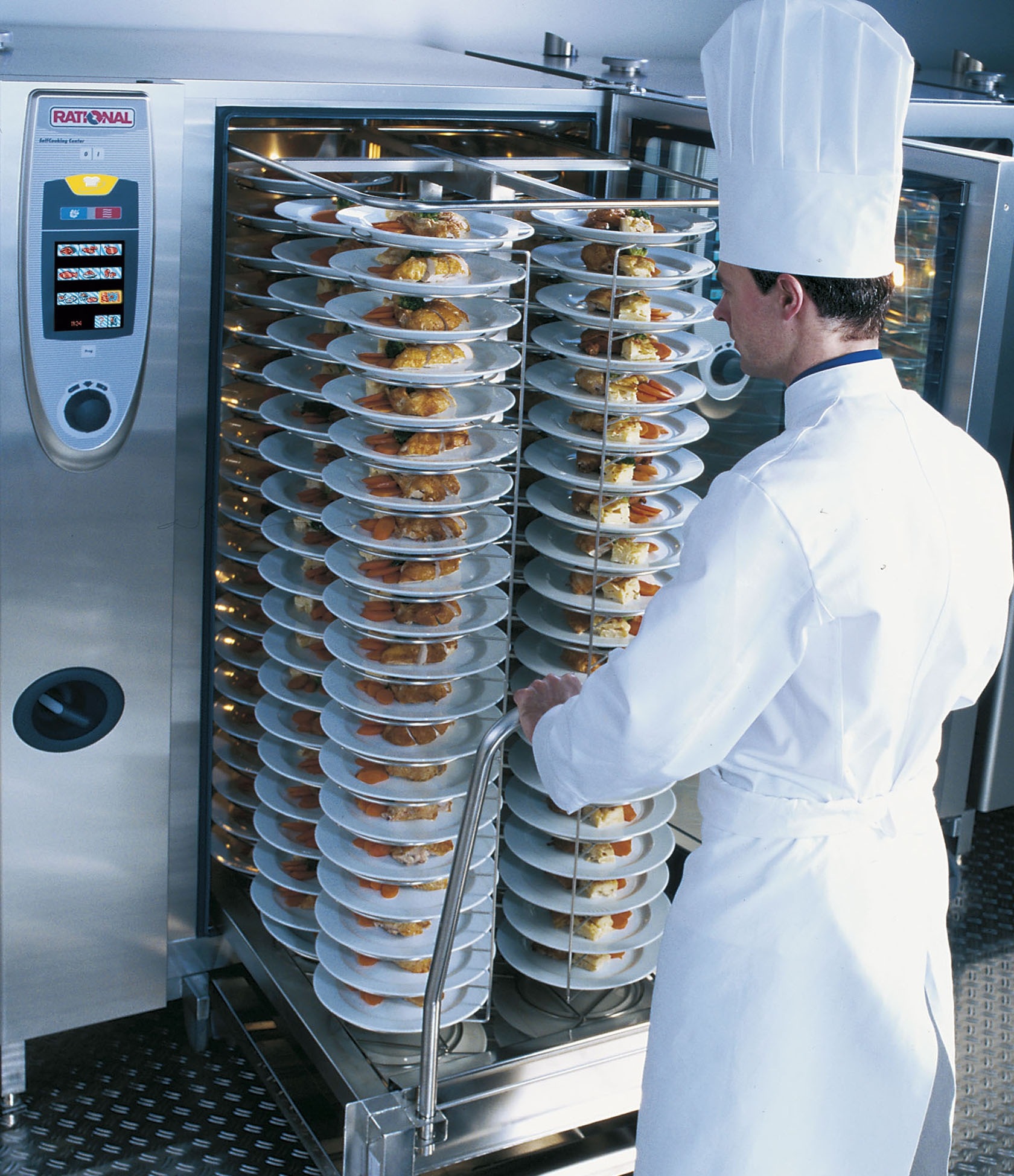 When regenerating food in bulk with Rational’s Finishing feature, the chef plates the meal in advance and stores it chilled. Just before it is required, it is loaded into the SelfCooking Center and the Finishing function brings it up to serving temperature – anything from 20 plates to nearly 200 can be ‘Finished’ at once, depending on the model of SelfCooking Center. Special trolleys that store the plated meals can be wheeled directly from the refrigerator into the Rational, minimising handling.