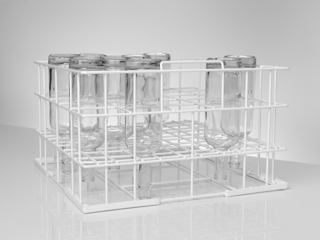 The rack has been designed by Winterhalter, the leading warewasher manufacturer, to clean up to twenty five Eau de Vie bottles at a time. The bottles are held upside down so the glasswasher’s cleaning programme, combining sprayed water, steam and condensation, sanitises them effectively.