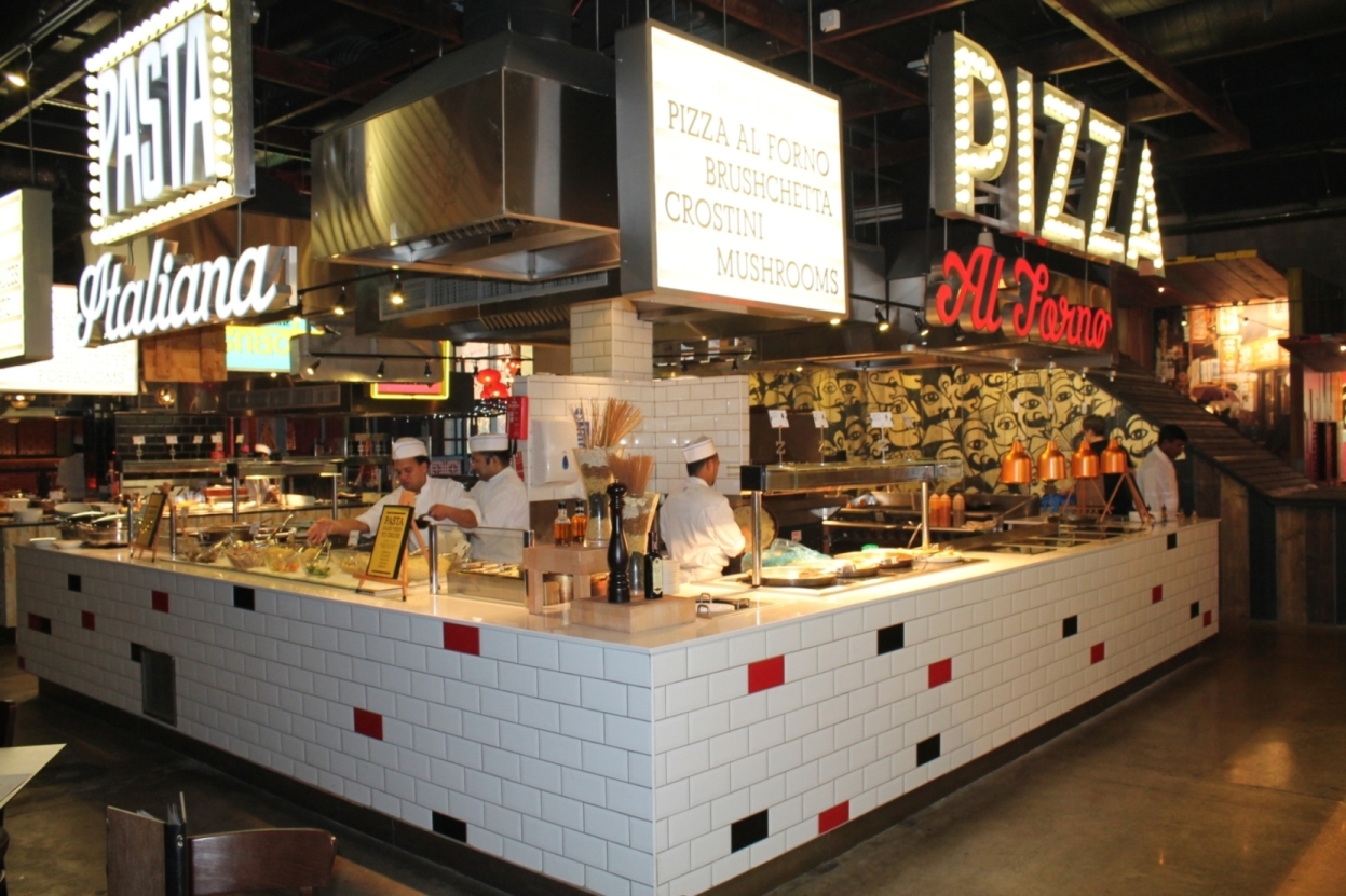 The counters were designed to house an array of theatre cooking that mimics styles found around the world. So the Indian counter has a tandoori oven, the Chinese one a wok station, the European counter includes a chargrill and a carvery, while the Tex Mex counter features live cooking of fajitas and Mexican chicken wings.