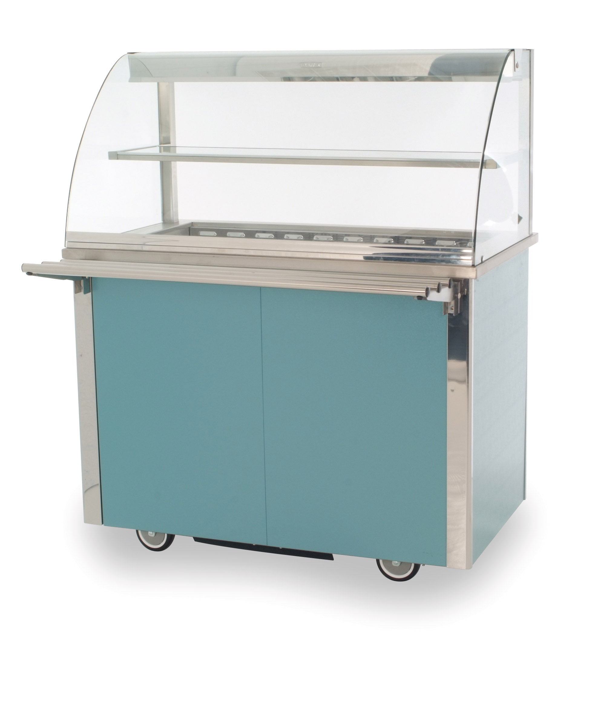 Versicarte is a modular system of trolleys that caterers can use to create a complete food servery area. Butted together they form a straight or angular service counter, while stand alone units can create a free-flow self-service environment. The new Deli models feature attractive, curved glass screens, glass shelving and an illuminated gantry that all help display the food to best advantage. They also have a useful storage cabinet below.