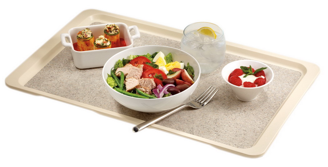 The reinforced polyester tray is non-skid, to provide a stable surface for safer meal delivery. This reduces spills and eliminates the expense and waste of using paper tray mats.