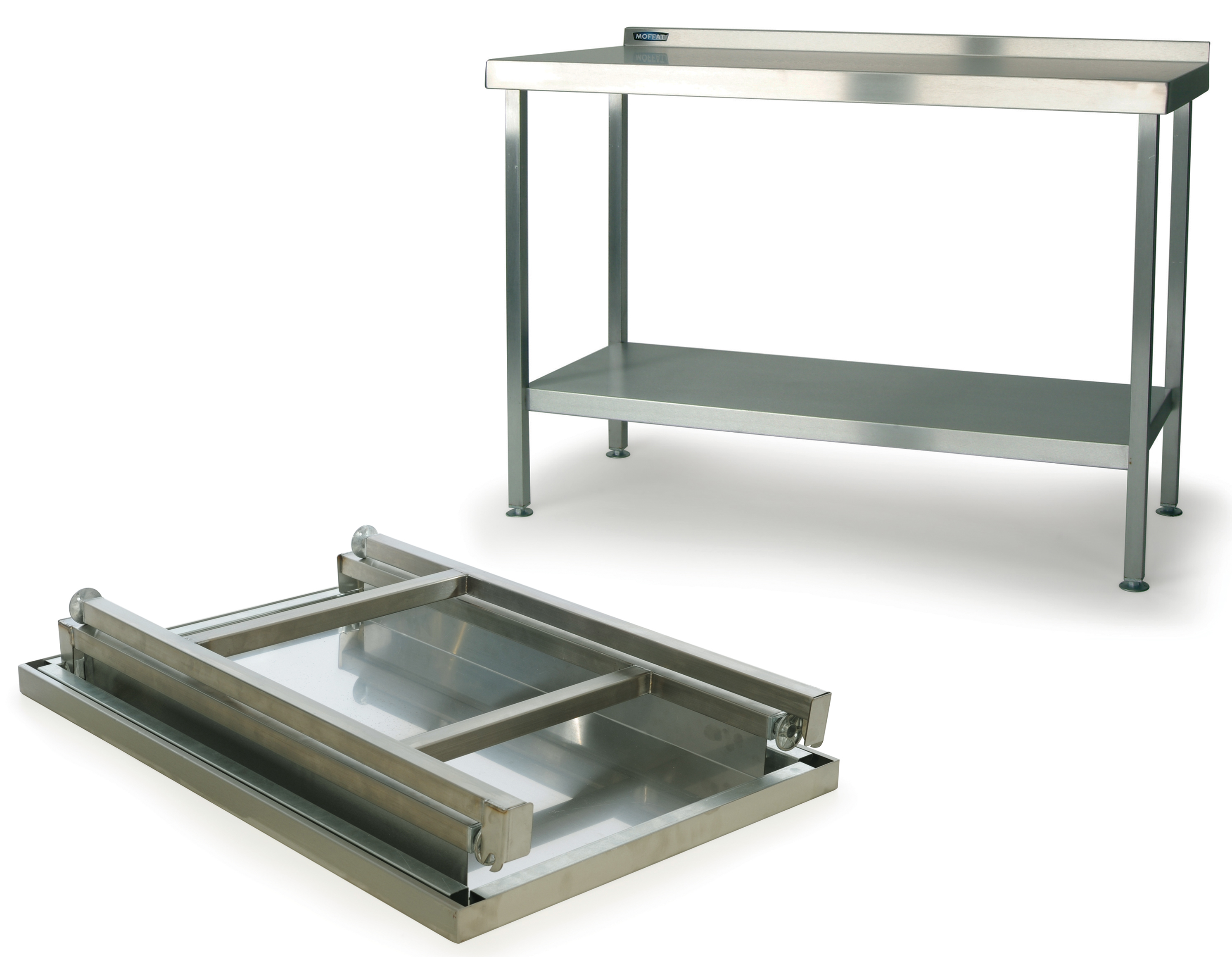 All wall benches have a stainless steel top, which is reinforced with a galvanised plate to give added strength and stiffness to the work surface. They have a 40mm upstand to rear and corresponding turn down on the other three sides. A stainless steel undershelf provides useful storage space as well as holding the legs firmly in position.