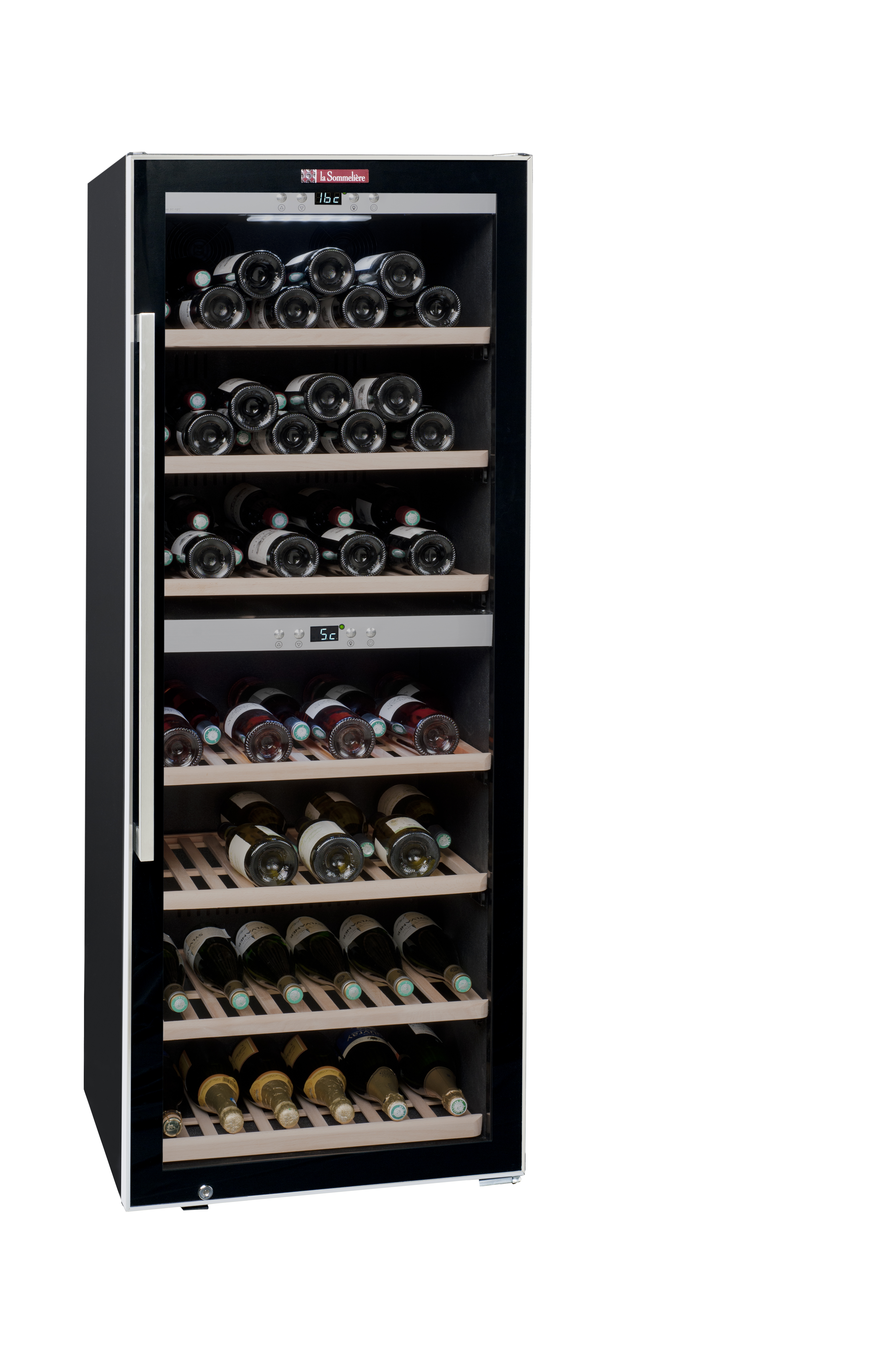 La Sommelière is a French company founded in 1993 which in recent years, has become a major player in the French wine cabinet market. The ECS135.2Z is a free-standing, dual temperature zone cabinet, which can store up to 126 bottles of wine in ideal temperature conditions. The upper compartment has a capacity of 60 bottles and the lower 66 bottles, both haveindependent adjustable temperature controls, between 3°C to 22°C, making it possible to store both red and white wine in the same cabinet.
