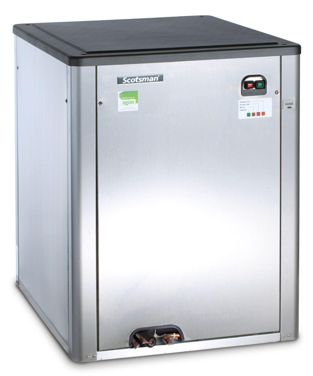 small footprint, by taking the compressor & condenser away from the ice-making unit. The compact size makes it ideal for places where space is at a premium. Meanwhile, separating the refrigeration system keeps noise and waste heat away from the kitchen or bar area. Its modular design means additional units can easily be linked together if greater production capacity is required.