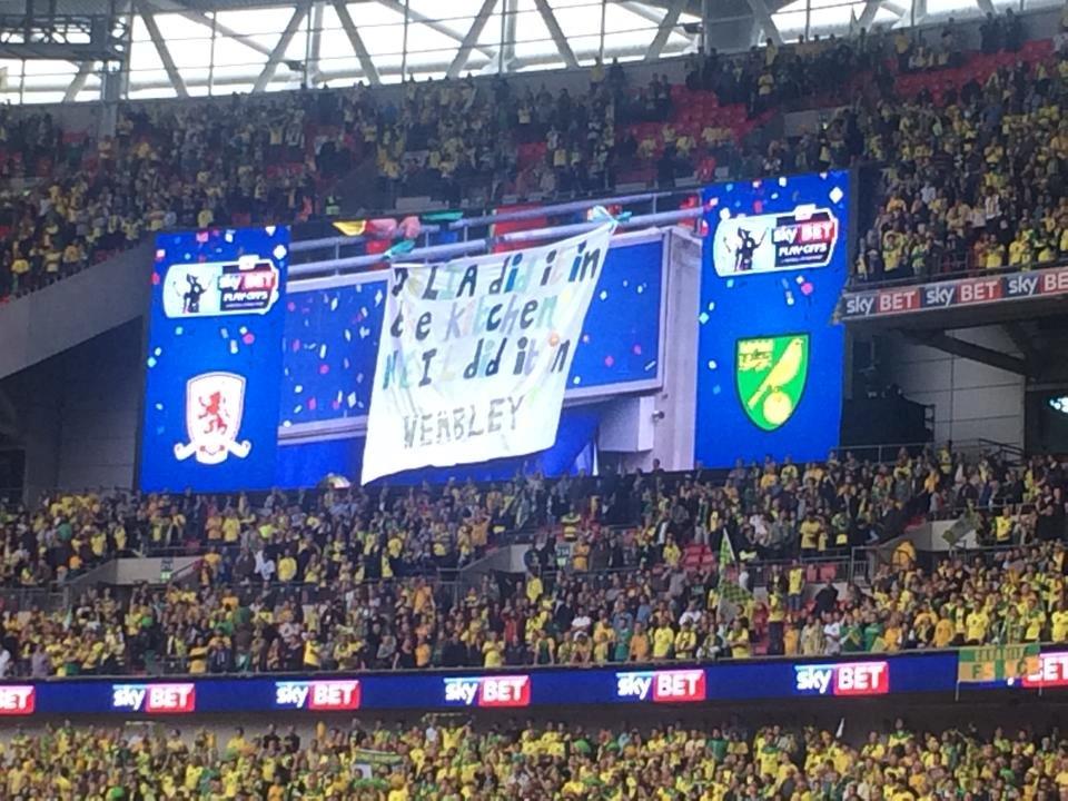 You’re looking at a sign that’s famous! Our very own Alison, whose family are all Norwich FC mad, made it with her own fair hands. And the folk at Wembley were so impressed by her wit that they put it on the screen, where Delia herself saw it – she was being interviewed by Radio 5L at the time, so it went all national on us. Then a Sun journalist tweeted it. Which is all just dandy and iced that promotion cake nicely.